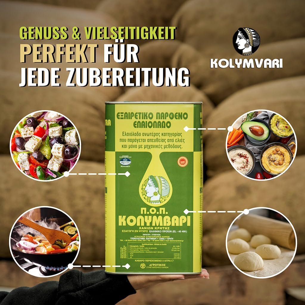 Erleben Sie das Aroma und die Qualität des Kolymvari Extra Nativ Olivenöls – aus Koroneiki Oliven Kretas mit geschützter Ursprungsbezeichnung (g.U.)