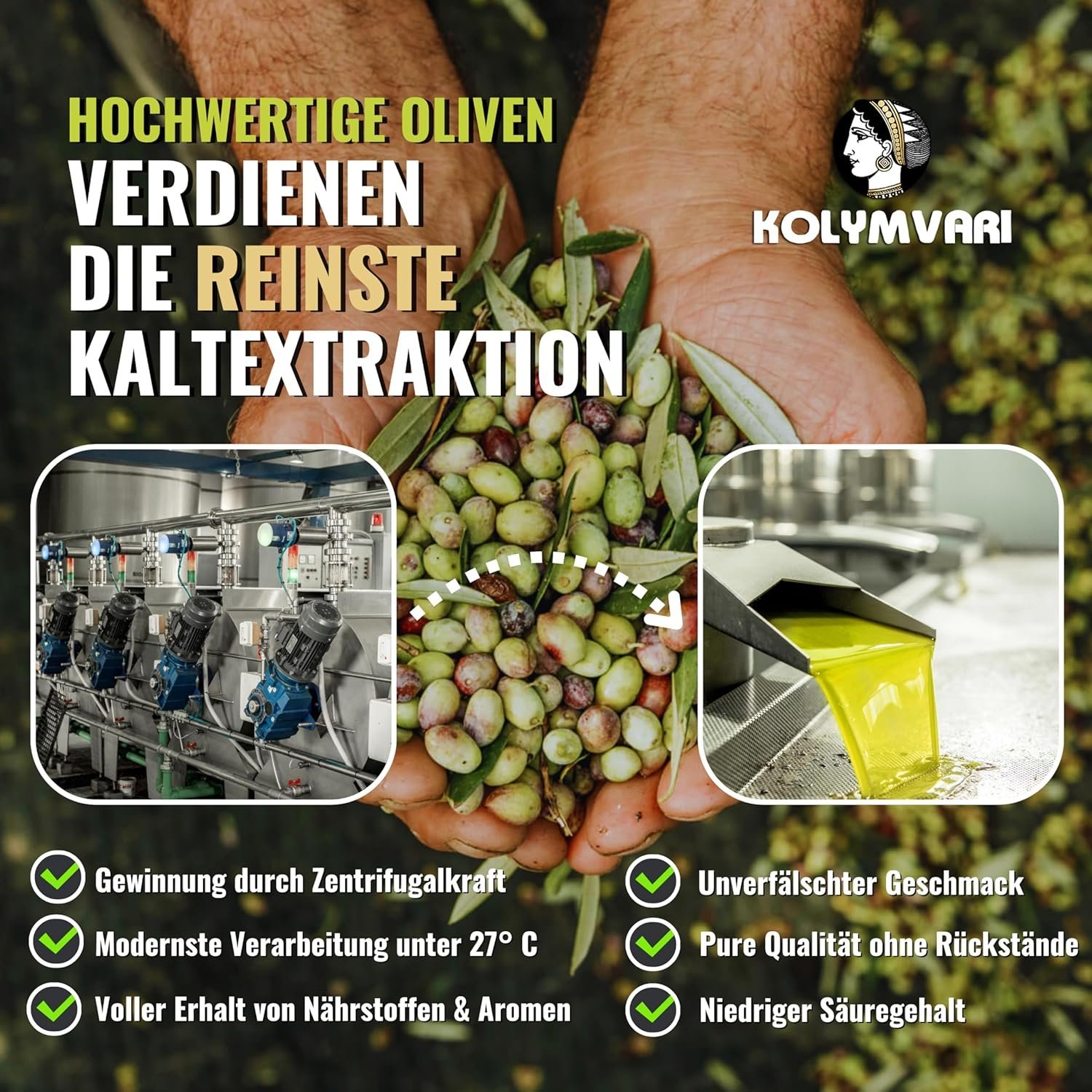 Die Kaltextraktion ist das modernste und schonendste Verfahren zur Olivenölgewinnung – deutlich überlegen zur veralteten Kaltpressung. Bei der Kaltextraktion wird das Öl unter 27 °C mittels Zentrifugentechnik gewonnen. So bleiben Nährstoffe, Antioxidantien und das volle Aroma optimal erhalten, was zu einem reinen, hochwertigen und geschmackvolleren Olivenöl führt.